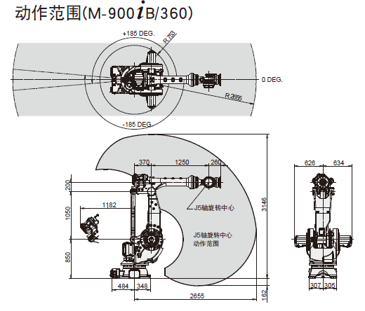 · M-900iB/360 可搬运质量为360kg的高速型机器人。具有紧凑的手腕和高速的动作性能,适用于搬运和点焊等应用。而且可以进行顶吊安装。